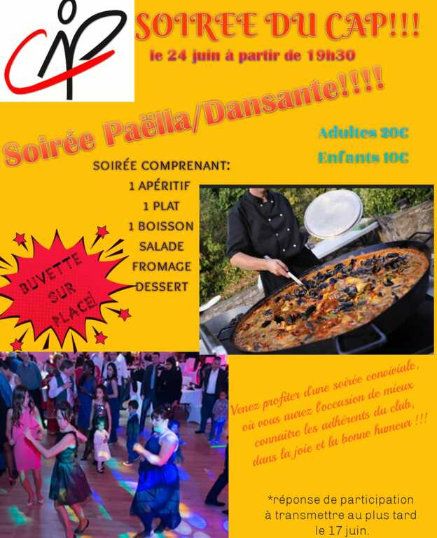 Le coût de cette soirée sera de 20 euros par personne pour les adultes et de 10 euros pour les enfants de moins de 12 ans. Ce tarif inclus l'apéro, la paëlla, le fromage, le dessert, la boisson à table et le café.