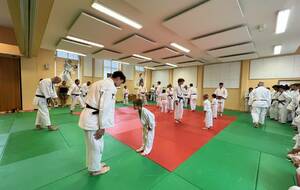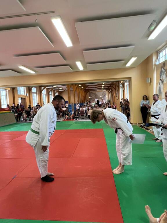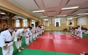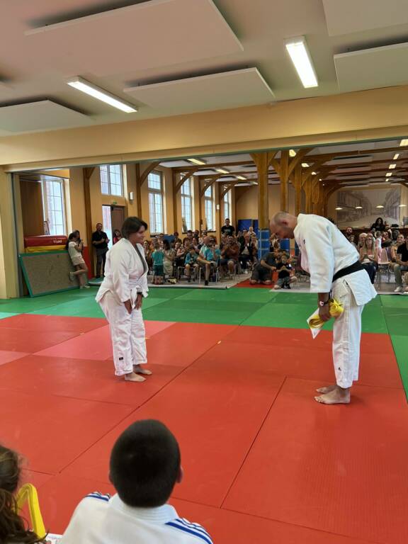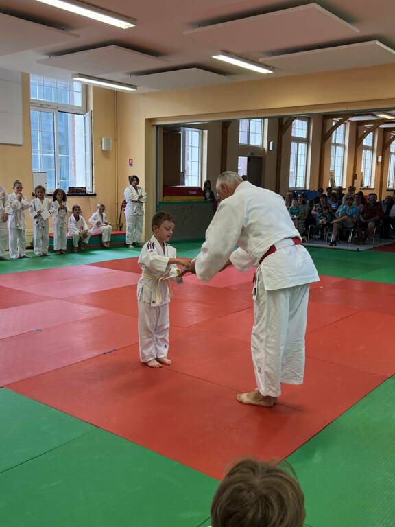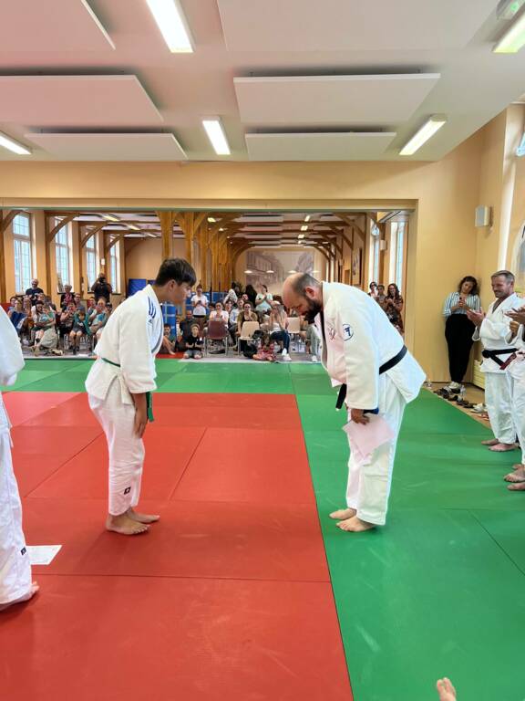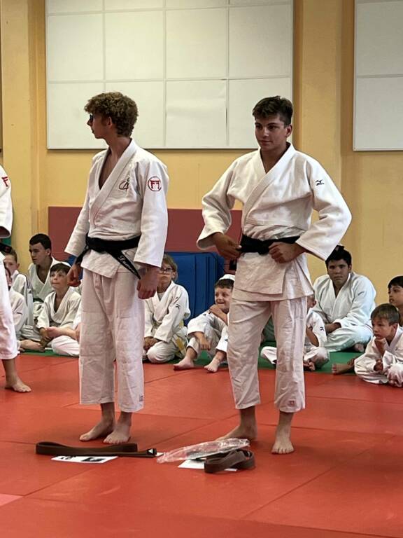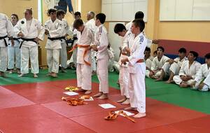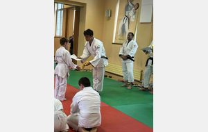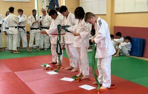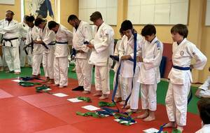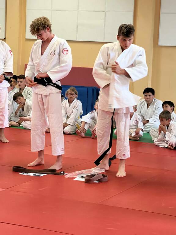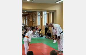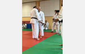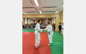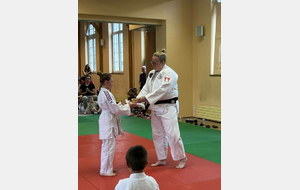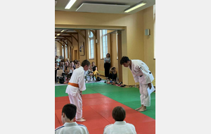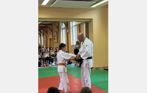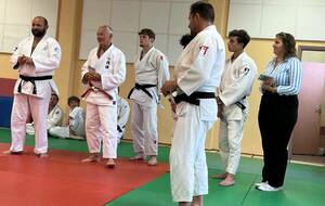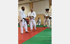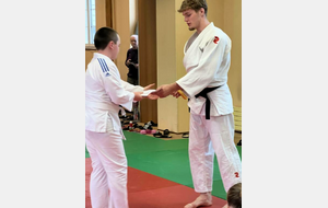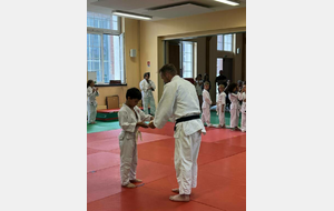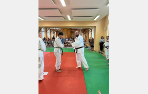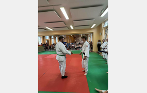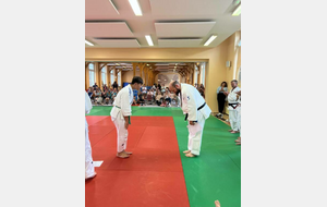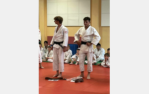 Un fois le salut général effectué ce sont les deux nouvelles ceintures noires de la saison Grégoire DUMONT et Pacôme FERTRAY, qui avaient l'honneur d'être les premiers à recevoir et porter leur nouveau grade, le 1er DAN, car comme l'expliquait Jean-Pierre, la ceinture noire c'est le début de la découverte et de l'approfondissement du judo... une partie d'expérience est acquise, une certaine maîtrise technique également et l'on peut enfin s'ouvrir à l'approfondissement... et continuer sur le chemin des Dan...