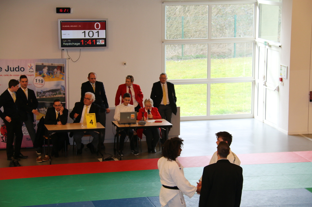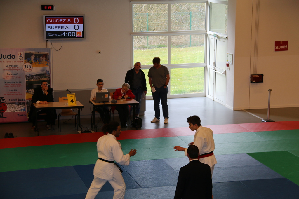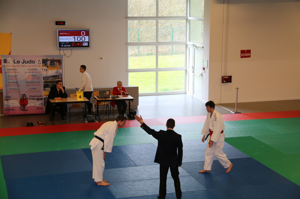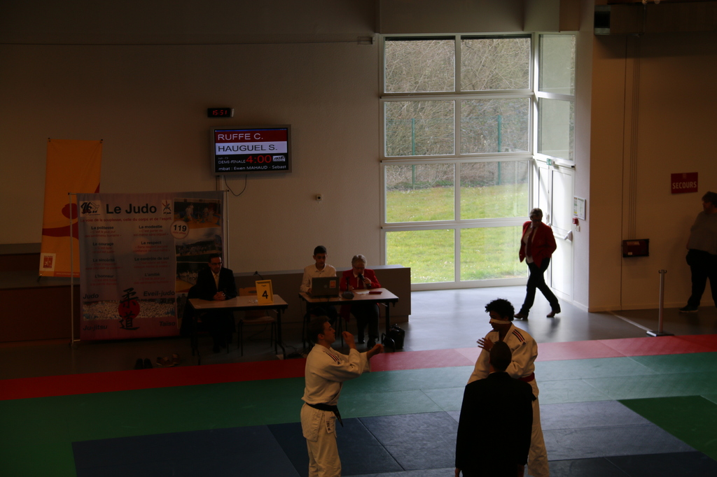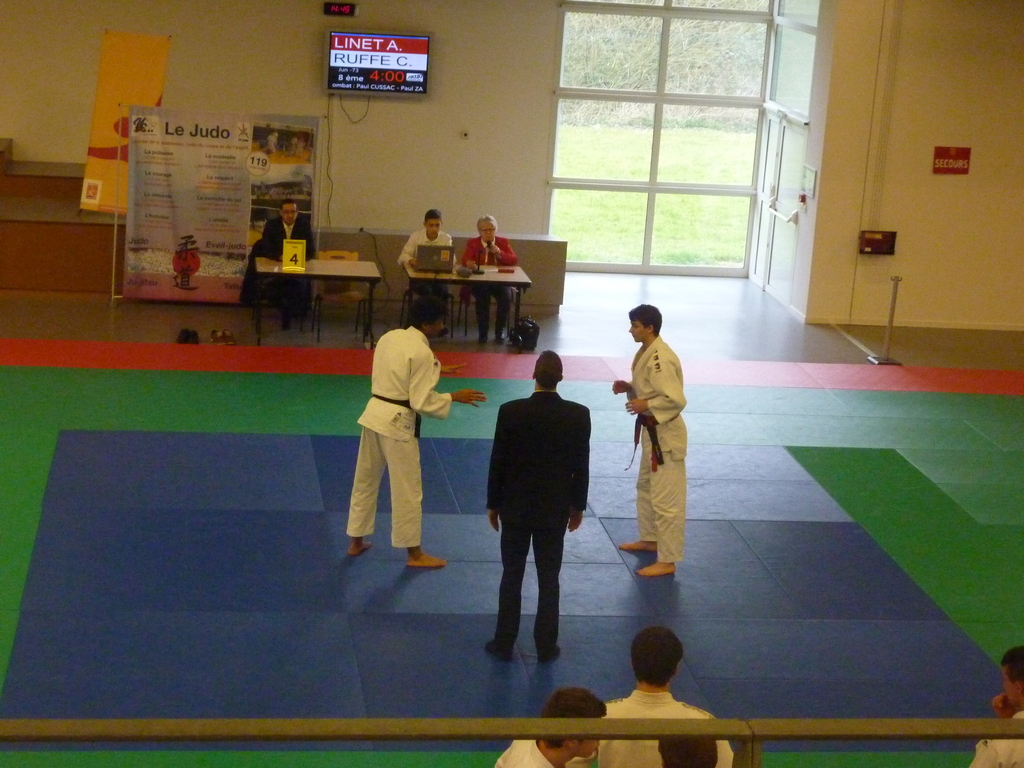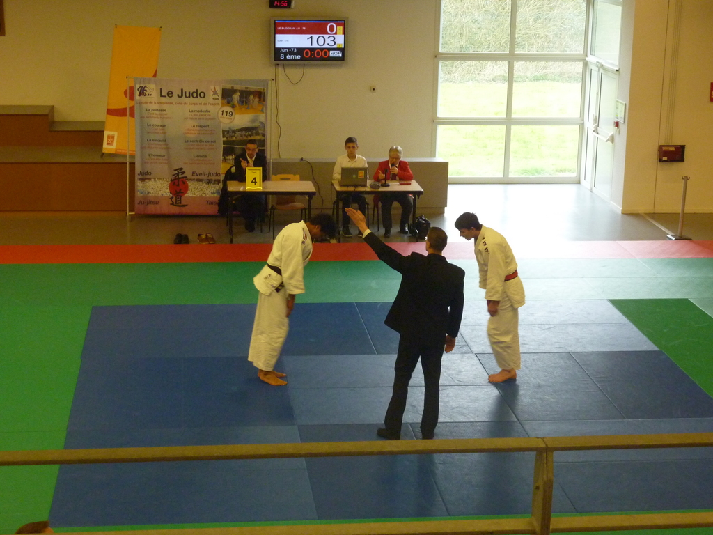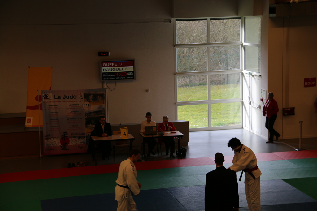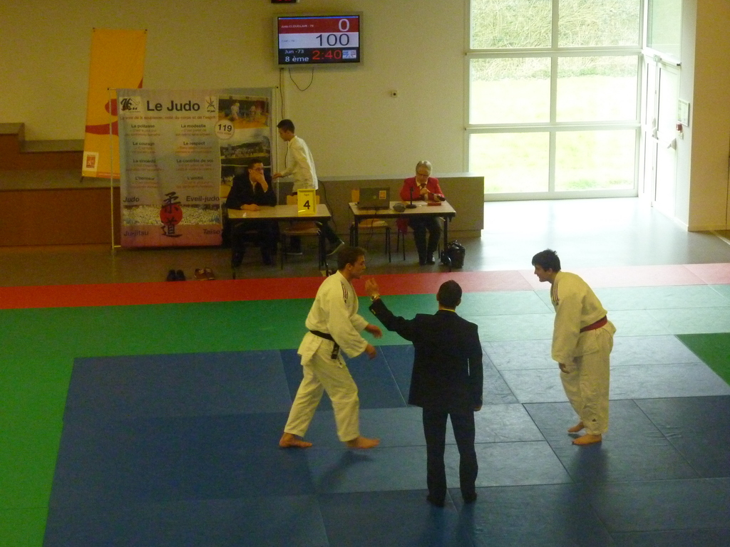 En -73, Valentin BOSSE perd son premier combat par un ippon et ne sera pas repêché. Il n'est pas classé. Alexandre RUFFE gagne son premier combat par un waza et un yuko mais s'incline sur son deuxième combat par deux waza. Il gagne ensuite ses deux combats de repêchage par ippon et se qualifie pour la place de 3 où il s'inclinera face à Sacha HAUGUEL en se faisant élinminer. Il termine donc 5ème. Sacha quant à lui gagne son premier combat par deux waza et son deuxième par ippon. Il s'inclinera ensuite en demi-finale face à Clément RUFFE par ippon. Il gagne ensuite sa place de 3 face à Alexandre et termine donc 3ème. Clément (qui est encore cadet) gagne ses deux premiers combats par ippon puis sa demi-finale face à Sacha également par ippon. Il gagne ensuite sa finale par un yuko et termine donc vainqueur de sa catégorie.