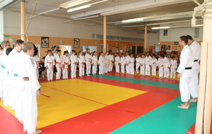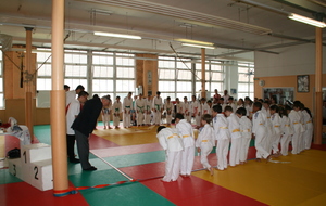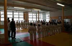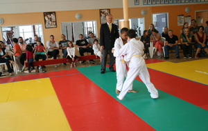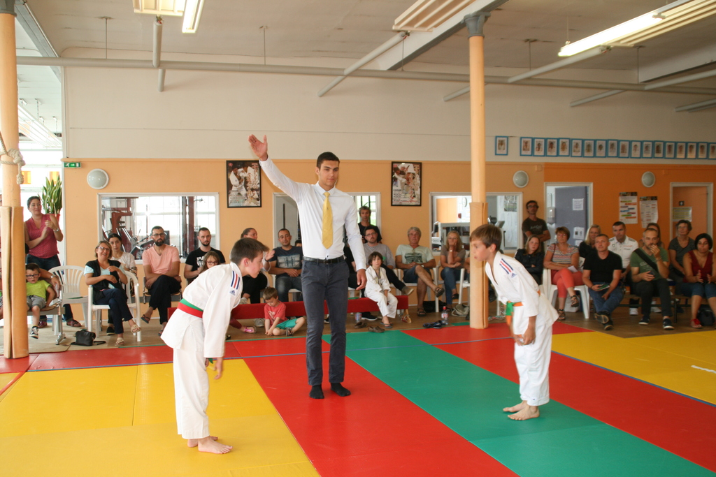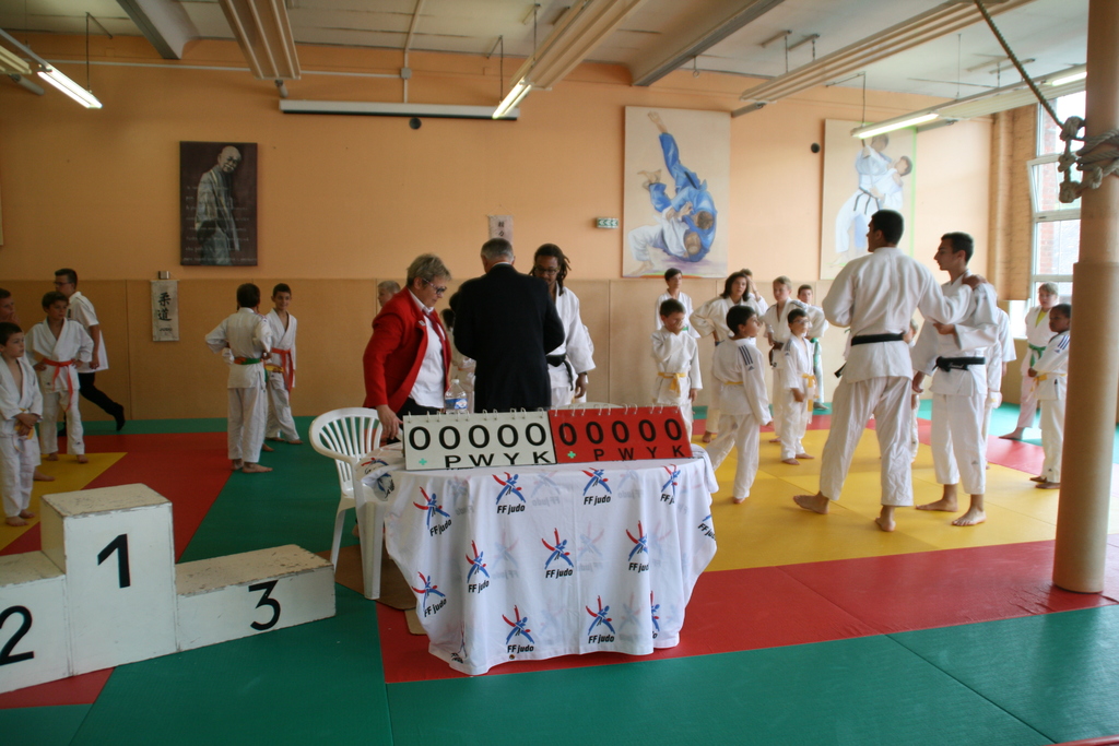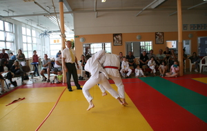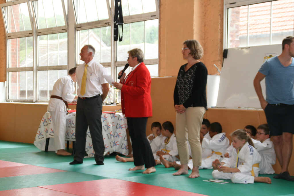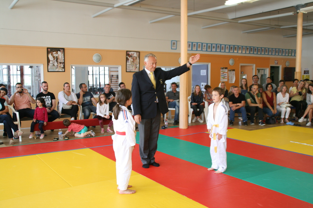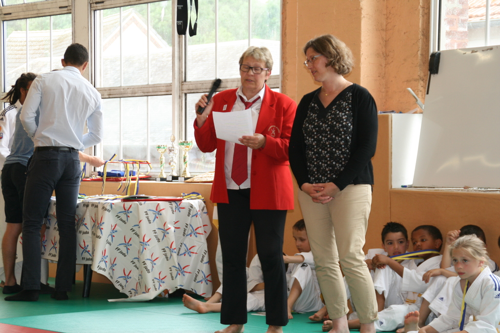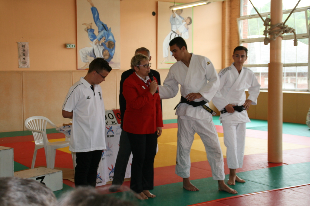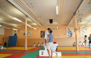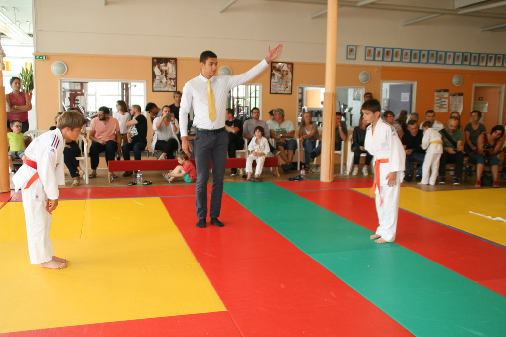 Après un salut tous ensemble pour ouvrir officiellement l'après-midi, les arbitres furent présentés : Jean-Pierre Defrance, 6ème dan, Arbitre National et Antonin Lory, 2ème Dan, vainqueur de la Coupe du jeune arbitre lorsqu'il était encore Cadet. Egalement pour orchestrer les combats : Baptiste Albert-Simar qui démarre la saison prochaine comme Commissaire-sportif stagiaire et Virginie Defrance Commissaire Sportif National et Arbitre départemental.