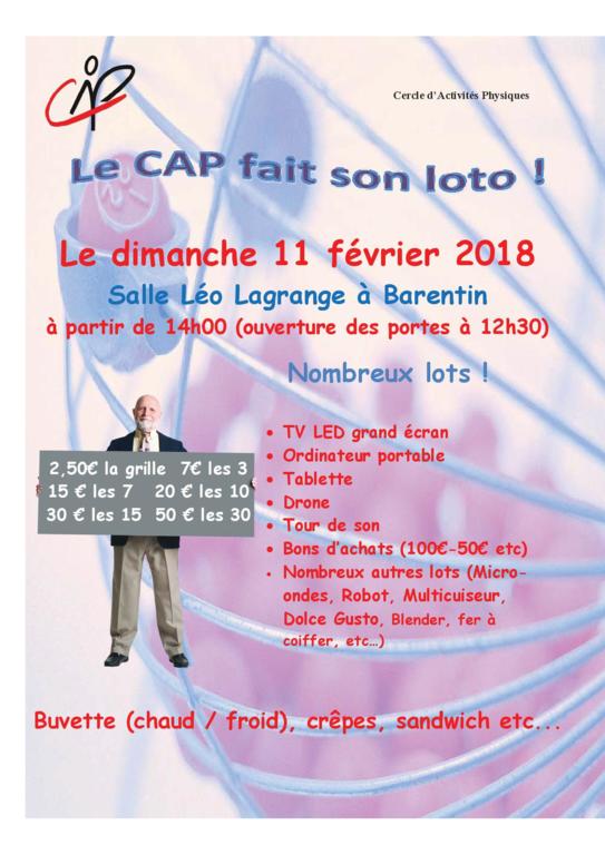Dimanche 5 février, le Cercle d’Activités Physiques Pavilly-Barentin organisera son traditionnel loto à la salle Léo Lagrange de Barentin.