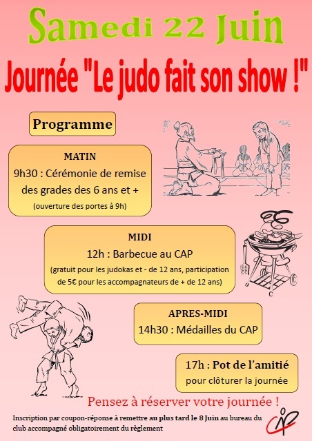 - 12h : Barbecue au CAP (gratuit pour les judokas et de - 12 ans, participation de 5€ pour les accompagnateurs de + 12 ans). Nous demandons aux familles d'amener, si possible, un gateau ou des friandises pour le dessert.