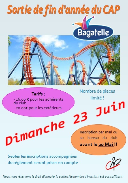Cette année, le CAP organise une sortie de fin d'année comme on a pu le faire par le passé. Nous avons décidé de vous emmener au parc d'attraction Bagatelle, situé dans le Pas-de-Calais. Cette journée aura lieu le Dimanche 23 Juin, au départ du CAP.