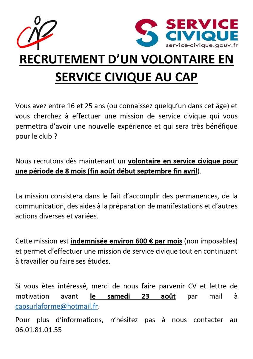 Si vous êtes intéressé, merci de nous faire parvenir CV et lettre de motivation avant le samedi 23 août par mail à capsurlaforme@hotmail.fr.